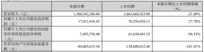 利亚德昨晚披露的2026年第一季度报告显示,公司首季实现营业收入13.04亿元,同比下降21.60%;归属于上市公司股东的净利润0.17亿元,同比下降77.78%;归属于上市公司股东的扣除非经常性损益的净利润0.03亿元,同比下降94.33%;经营活动产生的现金流量净额-0.84亿元,上年同期为1.39亿元。